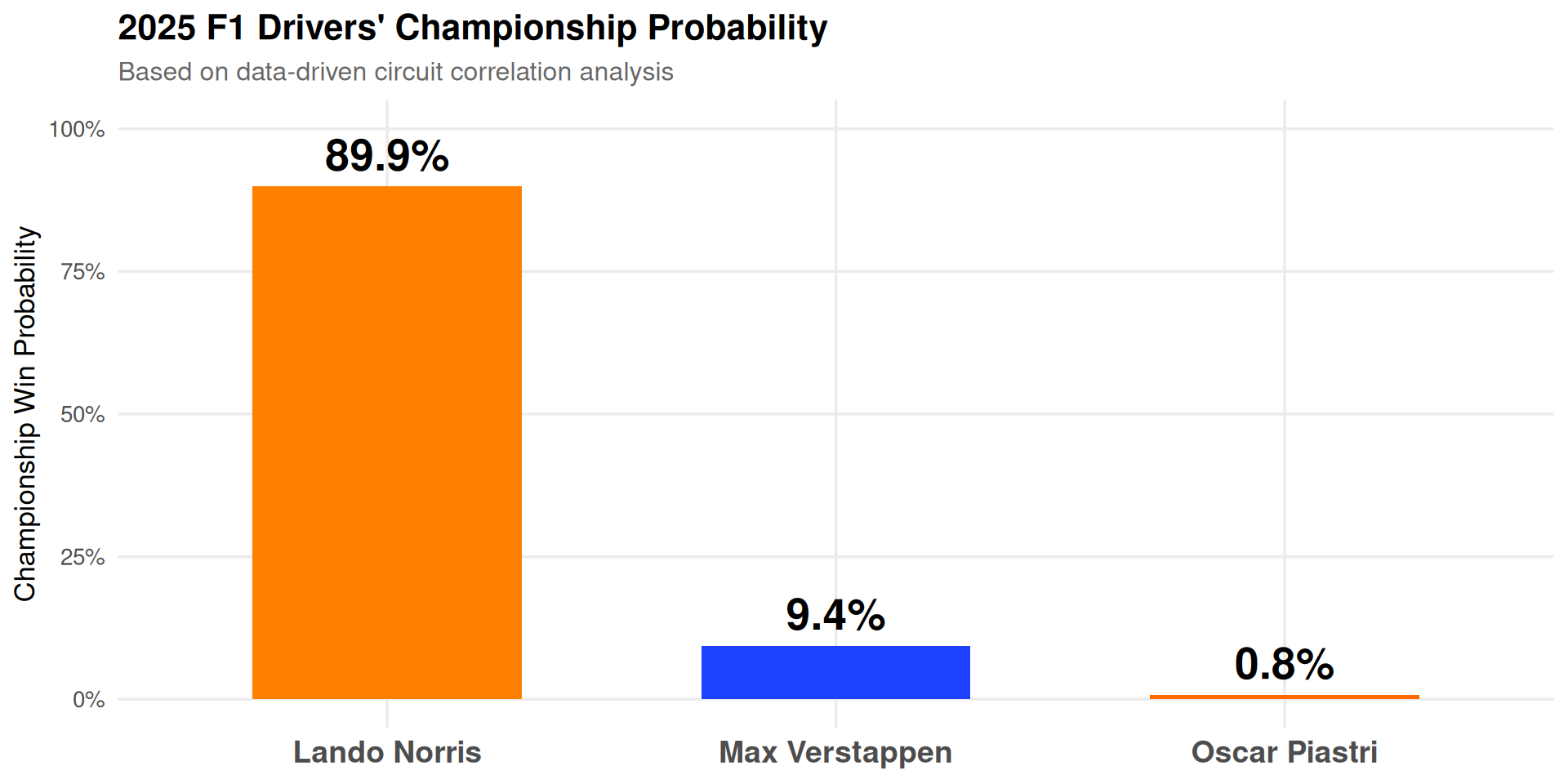 Figure 5: Championship probability breakdown based on circuit correlation analysis. Despite McLaren’s Qatar error, Norris’s 12-point cushion and consistent pace make him the strong favorite.
