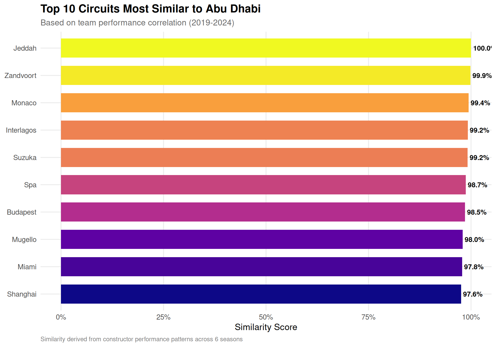 # Calculate pairwise correlations between circuits# Using Pearson correlation on team performance vectorscircuit_cor <-cor(t(perf_mat), use ="pairwise.complete.obs")# Convert to similarity (correlation already ranges -1 to 1, shift to 0-1)circuit_similarity <- (circuit_cor +1) /2# Find circuits most similar to Abu Dhabiabu_dhabi_name <-grep("Abu|Yas", rownames(circuit_similarity), value =TRUE, ignore.case =TRUE)[1]if (!is.na(abu_dhabi_name)) { abu_dhabi_similarity <- circuit_similarity[abu_dhabi_name, ] abu_dhabi_df <-tibble(circuit =names(abu_dhabi_similarity),similarity =as.numeric(abu_dhabi_similarity) ) %>% dplyr::filter(circuit != abu_dhabi_name) %>%arrange(desc(similarity))} else {# Fallback if Abu Dhabi not found abu_dhabi_df <-tibble(circuit =character(),similarity =numeric() )}