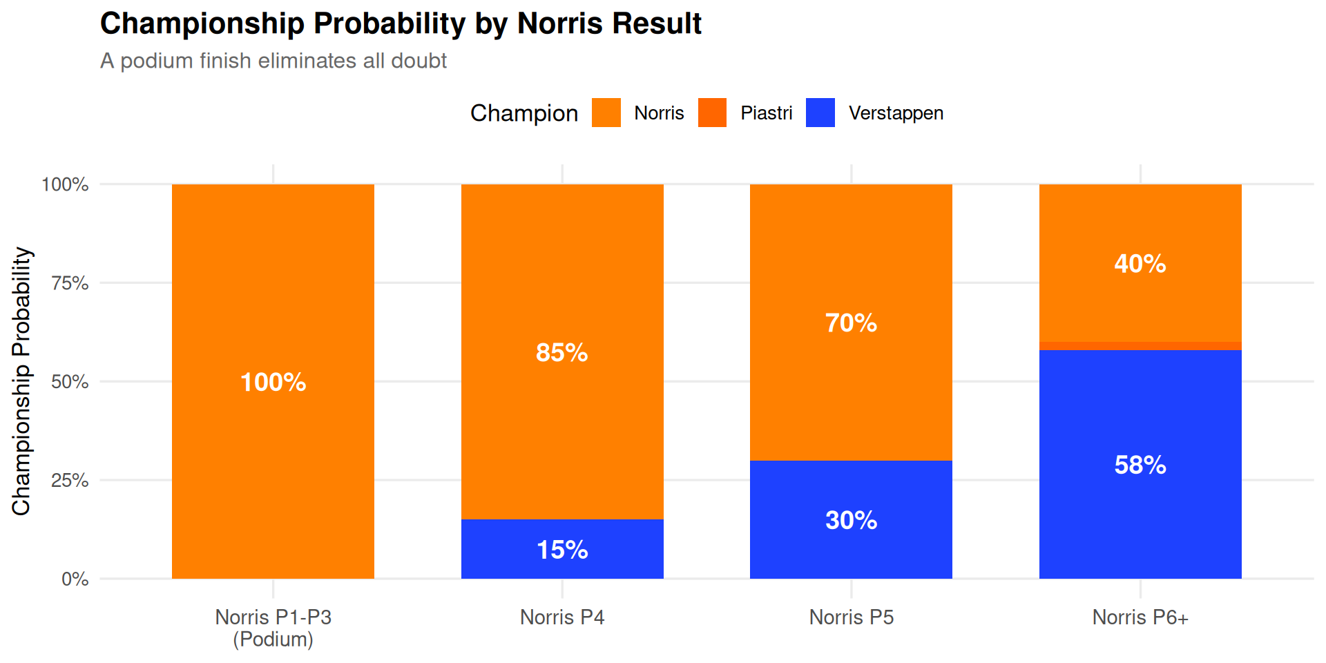 Figure 6: Championship outcomes conditional on Norris’s finishing position. A podium guarantees Norris the title; anything worse opens the door for Verstappen.