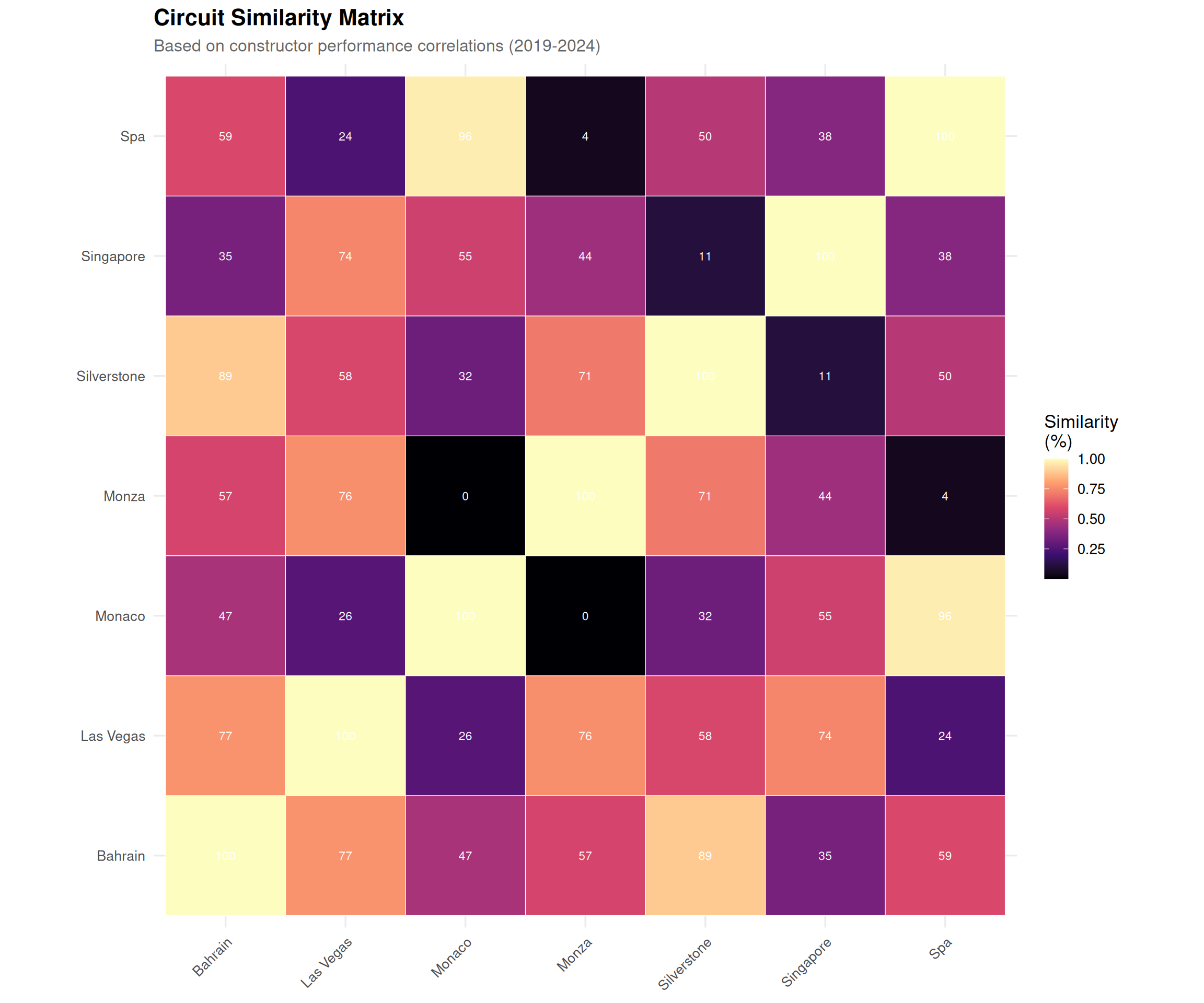 # Select circuits for visualization (focus on current calendar)current_circuits <-c("Abu Dhabi", "Bahrain", "Saudi Arabia", "Qatar","Singapore", "Las Vegas", "Monza", "Spa","Silverstone", "Monaco", "Hungary", "Austria")# Find matching circuit names in our dataavailable_circuits <-rownames(circuit_similarity)matched_circuits <-sapply(current_circuits, function(x) { matches <-grep(x, available_circuits, value =TRUE, ignore.case =TRUE)if (length(matches) >0) matches[1] elseNA})matched_circuits <- matched_circuits[!is.na(matched_circuits)]if (length(matched_circuits) >=5) {# Subset correlation matrix subset_cor <- circuit_similarity[matched_circuits, matched_circuits]# Convert to long format for ggplot cor_long <-as.data.frame(subset_cor) %>%mutate(circuit1 =rownames(.)) %>%pivot_longer(-circuit1, names_to ="circuit2", values_to ="correlation")ggplot(cor_long, aes(x = circuit1, y = circuit2, fill = correlation)) +geom_tile(color ="white") +geom_text(aes(label =sprintf("%.0f", correlation *100)),size =3, color ="white") +scale_fill_viridis_c(option ="magma", name ="Similarity\n(%)") +labs(title ="Circuit Similarity Matrix",subtitle ="Based on constructor performance correlations (2019-2024)",x =NULL,y =NULL ) +theme(axis.text.x =element_text(angle =45, hjust =1, size =10),axis.text.y =element_text(size =10) ) +coord_fixed()}