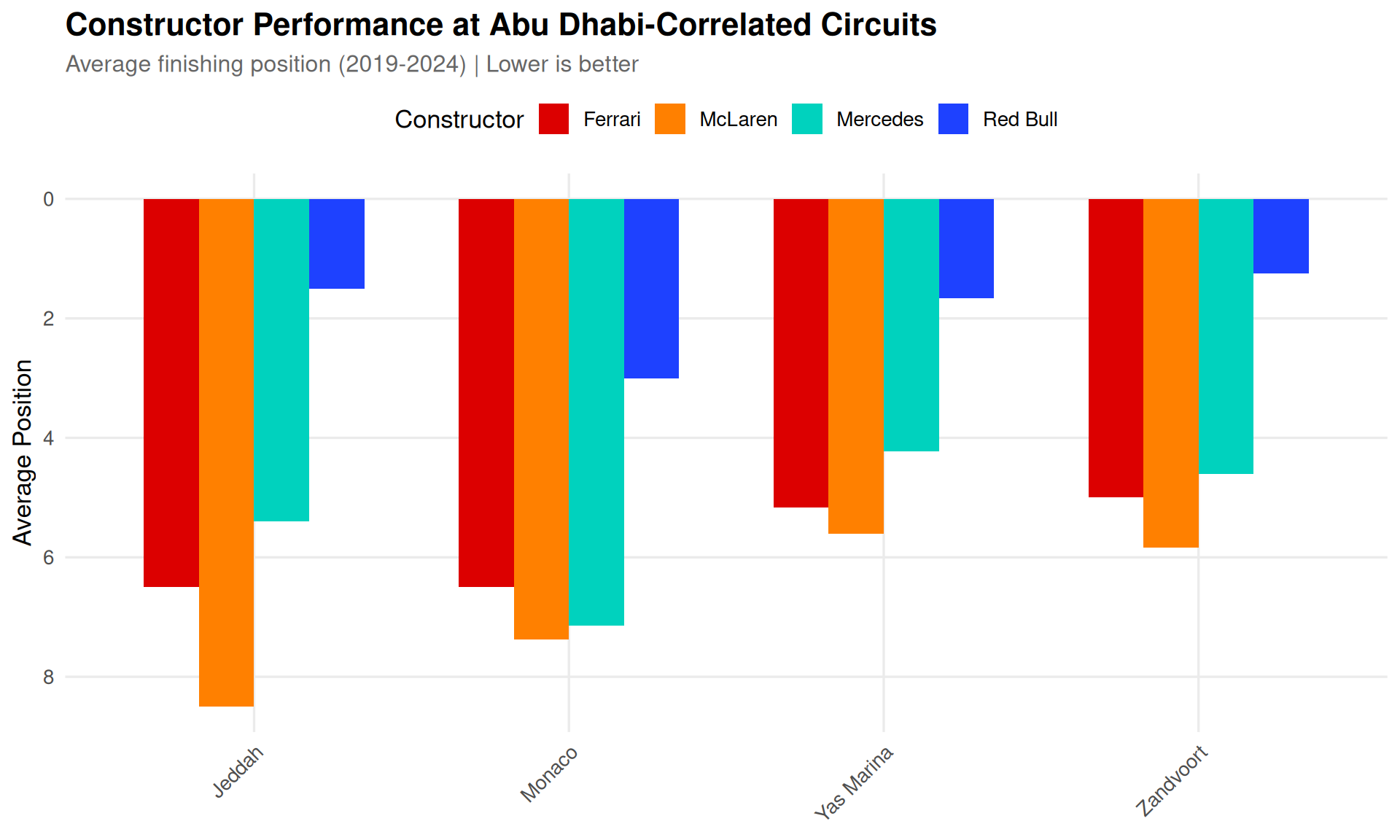 Figure 4: Average finishing position by constructor at Abu Dhabi and top 3 most similar circuits. Lower is better. Teams that perform well at correlated circuits are likely to perform well at Abu Dhabi.