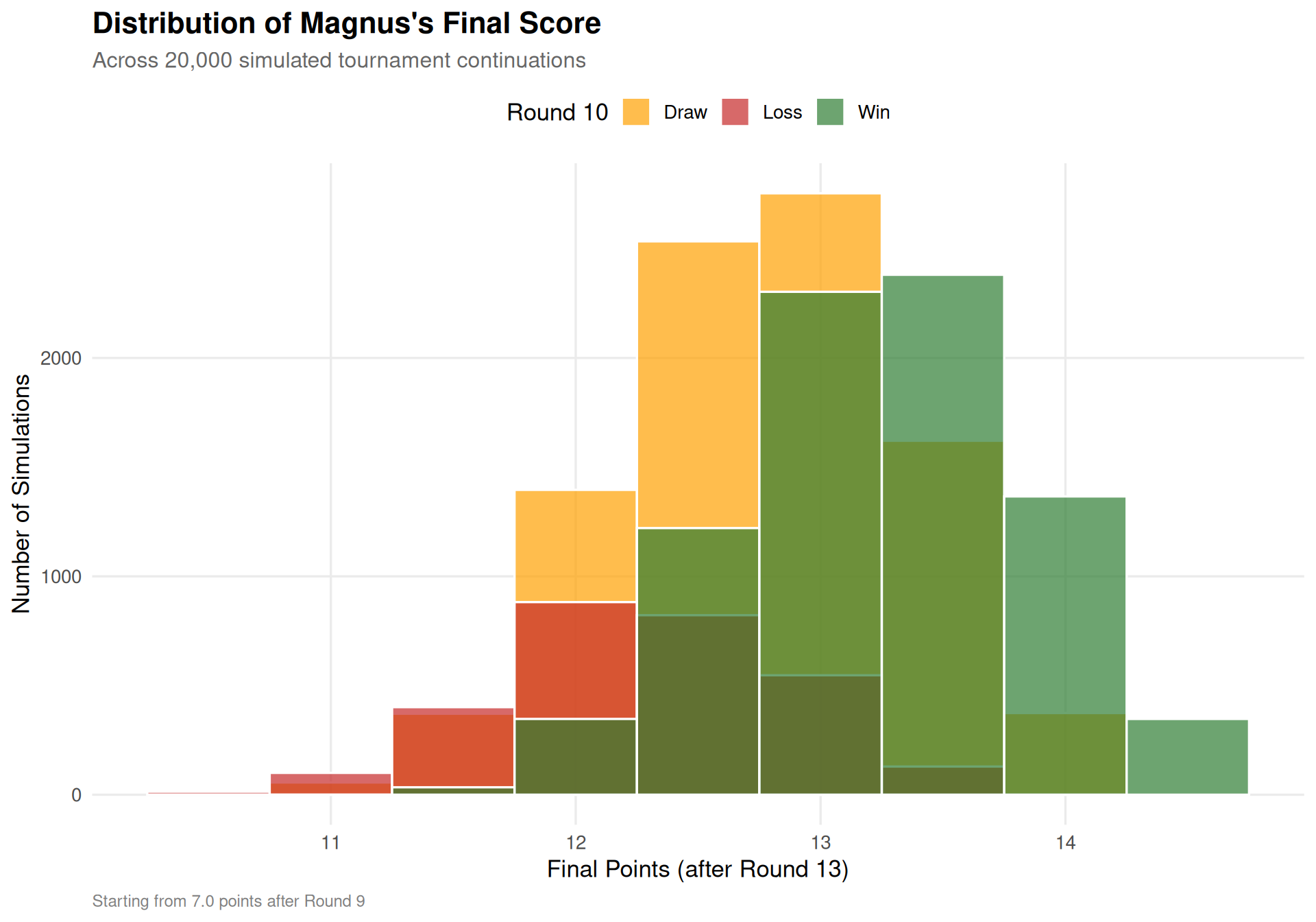 ---title: "Can Magnus Carlsen Win the 2025 World Rapid Championship?"subtitle: "A Monte Carlo Simulation of the Final Four Rounds"author: "Kieran Mace"date: "2025-12-28"categories: [Python, R, Chess, Monte Carlo, Simulation]format: html: code-fold: true code-tools: true toc: true toc-depth: 3 fig-width: 10 fig-height: 7 theme: cosmoexecute: warning: false message: false---```{r setup}#| include: falselibrary(tidyverse)library(scales)library(viridis)library(reticulate)library(knitr)# Set ggplot2 themetheme_set(theme_minimal(base_size = 13) + theme( plot.title = element_text(face = "bold", size = 16), plot.subtitle = element_text(size = 12, color = "gray40"), plot.caption = element_text(size = 9, color = "gray50", hjust = 0), panel.grid.minor = element_blank(), legend.position = "right" ))```# IntroductionThe 2025 World Rapid Chess Championship in New York is reaching its climax. After 9 grueling rounds of rapid chess, **Magnus Carlsen** sits on **7.0 points**, chasing the leaders as the tournament enters its final stretch. With four rounds remaining (Rounds 10-13), the championship remains wide open.In a 13-round Swiss tournament with over 200 players, predicting the winner is far more complex than a direct knockout. Players are paired based on their current score, meaning Magnus's path to victory depends not just on his own results, but on how the entire field performs.This analysis uses **Monte Carlo simulation** to answer the key question:> **What are Magnus Carlsen's chances of winning the World Rapid Championship, and how does his Round 10 result affect those odds?**# The Challenge of Swiss System TournamentsUnlike a round-robin or knockout format, Swiss system tournaments pair players with similar scores each round. This creates fascinating dynamics:- **Leaders face each other**: The top scorers are paired against each other, making it harder to maintain a lead- **Half-point leads matter**: In rapid chess with high draw rates, every half point is precious- **Tiebreaks add complexity**: Points alone may not determine the winnerFor our simulation, we'll focus on the primary criterion: **final point total**. Tiebreaks (Buchholz, Sonneborn-Berger, etc.) add another layer but require tracking every player's full history.# Data SourcesWe scrape live data from [Chess-Results](https://chess-results.com), the official tournament management system:```{python}#| label: load-data#| echo: trueimport pandas as pdimport numpy as npfrom simulation import ( load_crosstable_after_rd9, load_round_pairings, outcome_probs, simulate_with_round10_outcome)# Load current standingsstandings = load_crosstable_after_rd9()# Load Round 10 pairingsrd10_pairings = load_round_pairings()# Find Magnus's pairingmagnus_pairing = rd10_pairings[ (rd10_pairings["white"] =="Carlsen Magnus") | (rd10_pairings["black"] =="Carlsen Magnus")]```## Current Standings (After Round 9)```{r}#| label: standings-tablestandings_r <- py$standings %>%head(15) %>%select(rank, name, rtg, pts) %>%rename(Rank = rank,Player = name,Rating = rtg,Points = pts )kable(standings_r, caption ="Top 15 players after Round 9")```## Round 10 Pairings (Published)```{r}#| label: pairings-table# Get top board pairingspairings_r <- py$rd10_pairings %>%head(10) %>%select(board, white, white_rtg, white_pts, black, black_rtg, black_pts) %>%rename(Board = board,White = white,`W.Rtg`= white_rtg,`W.Pts`= white_pts,Black = black,`B.Rtg`= black_rtg,`B.Pts`= black_pts )kable(pairings_r, caption ="Top 10 boards for Round 10")``````{python}#| label: magnus-opponent# Magnus's Round 10 opponentmagnus_row = magnus_pairing.iloc[0]if magnus_row["white"] =="Carlsen Magnus": magnus_color ="White" opponent_name = magnus_row["black"] opponent_rtg = magnus_row["black_rtg"]else: magnus_color ="Black" opponent_name = magnus_row["white"] opponent_rtg = magnus_row["white_rtg"]magnus_rtg = standings[standings["name"] =="Carlsen Magnus"]["rtg"].values[0]magnus_pts = standings[standings["name"] =="Carlsen Magnus"]["pts"].values[0]```:::{.callout-note appearance="simple"}## Magnus Carlsen's Round 10 Matchup**Magnus Carlsen** (`r sprintf("%.0f", py$magnus_rtg)`) plays **`r py$magnus_color`** against **`r py$opponent_name`** (`r sprintf("%.0f", py$opponent_rtg)`).Magnus is currently on **`r py$magnus_pts` points** after 9 rounds.:::# The Probability ModelFor each game, we use an **Elo-style probability model** with an adjustable draw rate. The model:1. Calculates expected score using the standard Elo formula2. Adjusts draw probability based on rating difference (closer ratings → more draws)3. Splits the remaining probability between wins for each player```{python}#| label: probability-demo#| echo: true# Example probabilities for Magnus vs his Round 10 opponentif magnus_color =="White": p_win, p_draw, p_loss = outcome_probs(magnus_rtg, opponent_rtg, draw_base=0.37)else: p_loss, p_draw, p_win = outcome_probs(opponent_rtg, magnus_rtg, draw_base=0.37)prob_display = pd.DataFrame({"Outcome": ["Magnus Wins", "Draw", "Magnus Loses"],"Probability": [f"{p_win:.1%}", f"{p_draw:.1%}", f"{p_loss:.1%}"]})``````{r}#| label: prob-tablekable(py$prob_display, caption ="Round 10 outcome probabilities for Magnus")```The `draw_base` parameter is set to 0.37, reflecting the higher draw rates typical in rapid chess at the elite level.# Monte Carlo SimulationWe simulate the remaining 4 rounds (10-13) across **20,000 possible futures**:- **Round 10**: Uses the published pairings from Chess-Results- **Rounds 11-13**: Uses an approximate Swiss pairing algorithm (score groups + rating sort)```{python}#| label: run-simulation#| echo: true# Run simulation with Round 10 outcome trackingresults = simulate_with_round10_outcome( n_sims=20000, seed=42, focus_top_n=80, draw_base=0.37, focus_player="Carlsen Magnus")# Overall championship probabilityoverall_prob = results["focus_is_co_winner"].mean()# Conditional probabilities by Round 10 outcomecond_probs = results.groupby("focus_rd10_outcome").agg({"focus_is_co_winner": ["